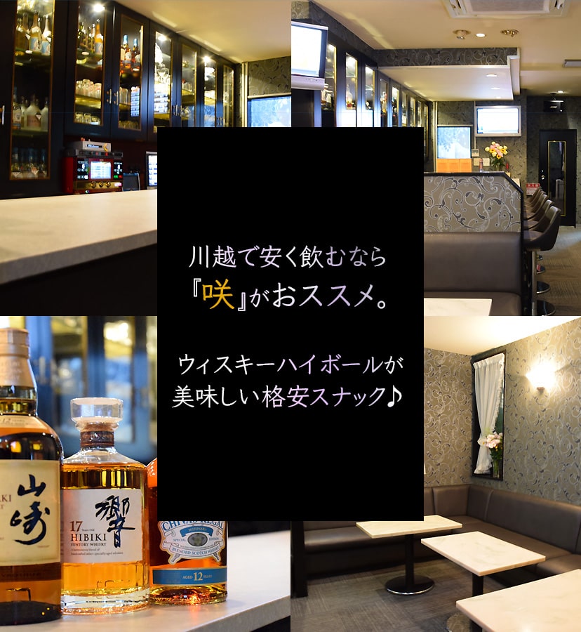 川越駅、東口 駅を背にアトレを左手に見ながらデッキ30Mほど直進。1階の路上におり左手・ローソンを20M更に直進。1本目の路地を左折、10Mほどいくとスナック「咲」があります。